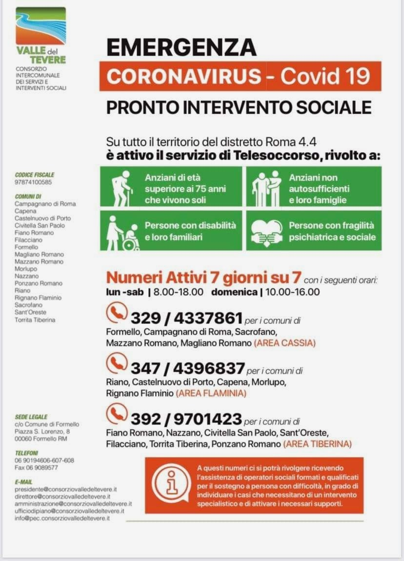 Il “Consorzio Valle del Tevere”, alla luce dei DPCM del 9 e dell’11 Marzo 2020, ha attivato un progetto per andare incontro a quelle categorie che maggiormente risultano svantaggiate dalla sospensione delle attività e della rete sociale: anziani di età superiore ai 75 anni che vivono soli; anziani non autosufficienti e loro famiglie; alle persone con disabilità e ai loro familiari; alle persone con fragilità psichiatrica e sociale.