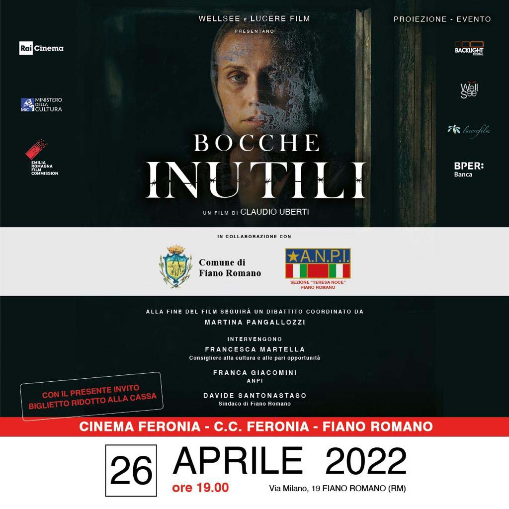 Il 26 aprile il film “Bocche Inutili” sarà proiettato al Cineferonia (via Milano, 19 – Fiano Romano) alle ore 19:00, a seguire si terrà un dibattito in sala con Franca Giacomini (ANPI “Teresa Noce” di Fiano Romano), Francesca Martella (Consigliera alla cultura e alle pari opportunità), Davide Santonastaso (Sindaco di Fiano Romano) e moderato da Martina Pangallozzi. Il film evento è patrocinato dal Comune di Fiano Romano.