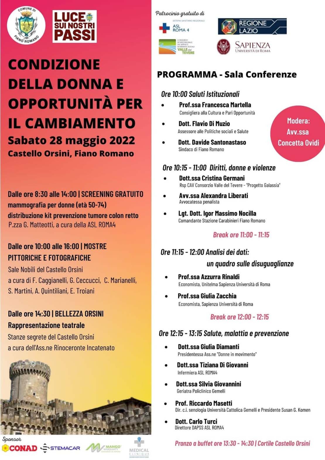 ore 10:00 – Saluti Istituzionali: prof.ssa Francesca Martella, Consigliera alla Cultura e pari opportunità; dott. Flavio Di Muzio, Assessore alle Politiche Sociali e Salute; dott. Davide Santonastaso, Sindaco del Comune di Fiano Romano.