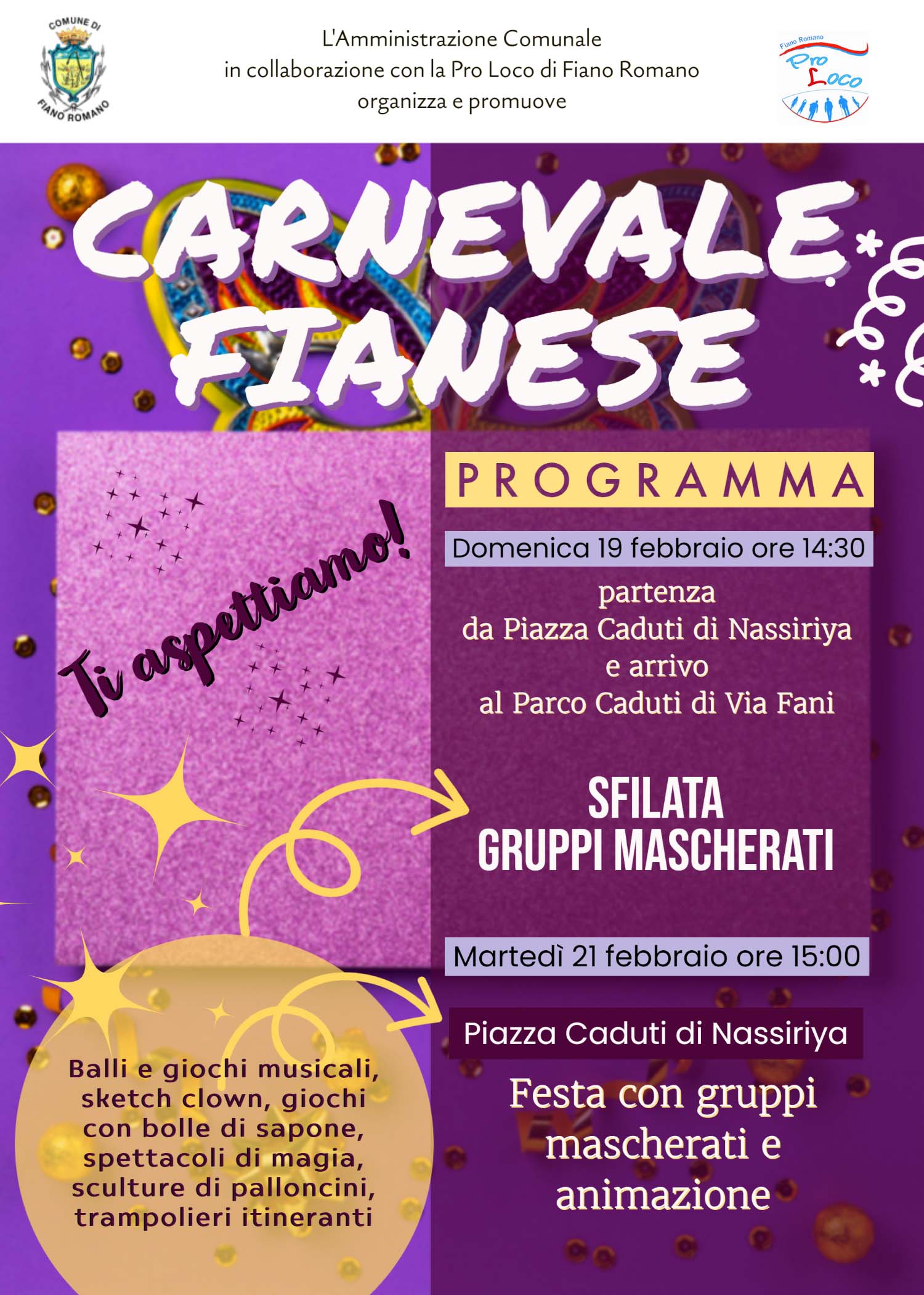 Domenica 19 dalle 14:30 e martedì 21 dalle ore 15:00 si svolgerà il Carnevale Fianese, organizzato dall’Amministrazione Comunale in collaborazione con la Pro Loco di Fiano Romano.