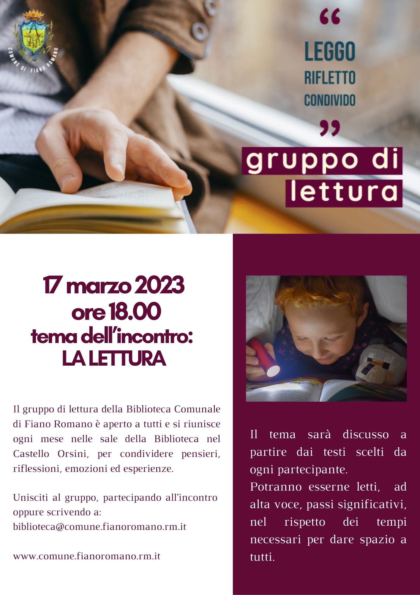 Il gruppo di lettura di Fiano Romano è aperto a tutti e si riunisce ogni mese nelle sale della Biblioteca Comunale, Castello Orsini di Fiano Romano, per condividere pensieri, riflessioni, emozioni ed esperienze in merito alle letture di ciascuno.