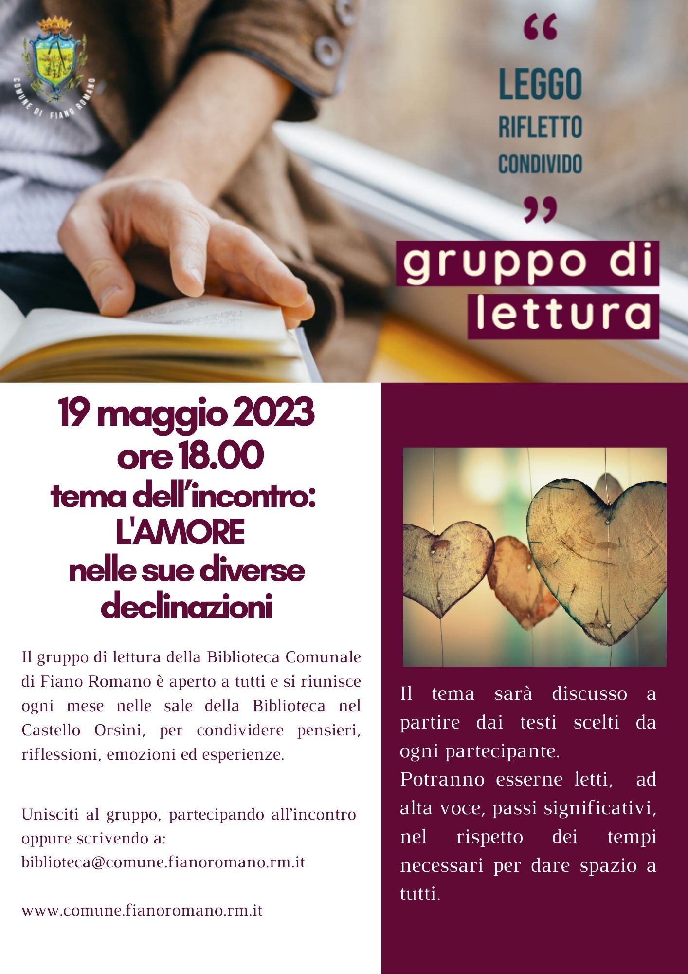 Il 19 maggio 2023 alle 18:00, si terrà l’ incontro del Gruppo di lettura il tema dell’incontro è L’AMORE NELLE SUE DIVERSE DECLINAZIONI.