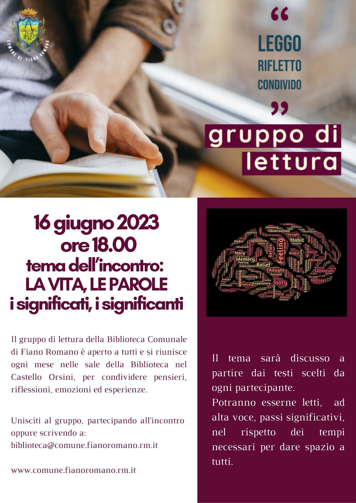 Il 16 giugno 2023 alle 18:00, si terrà l’ incontro del Gruppo di lettura il tema dell’incontro è LA VITA, LE PAROLE i significati, i significanti.