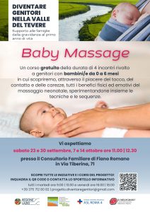 Un corso della durata di 4 incontri rivolti a genitori con bambini/e da 0 a 6 mesi, in cui scopriremo attraverso il piacere del tocco, del contatto e delle carezze, tutti i benefici fisici ed emotivi del massaggio neonatale, sperimentandone insieme le tecniche e le sequenze.