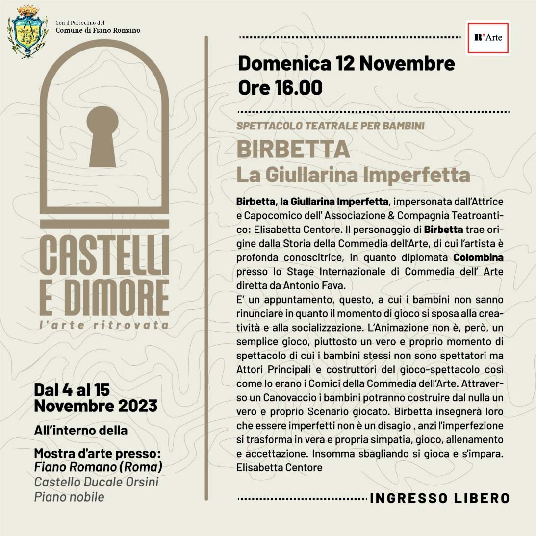 Nella giornata di domenica 12 novembre, alle ore 16:00 una breve performance teatrale intitolata ” Birbetta la Giullarina imperfetta “dedicata a bambini ed oltre, interpretata dall’attrice Elisabetta Centore.