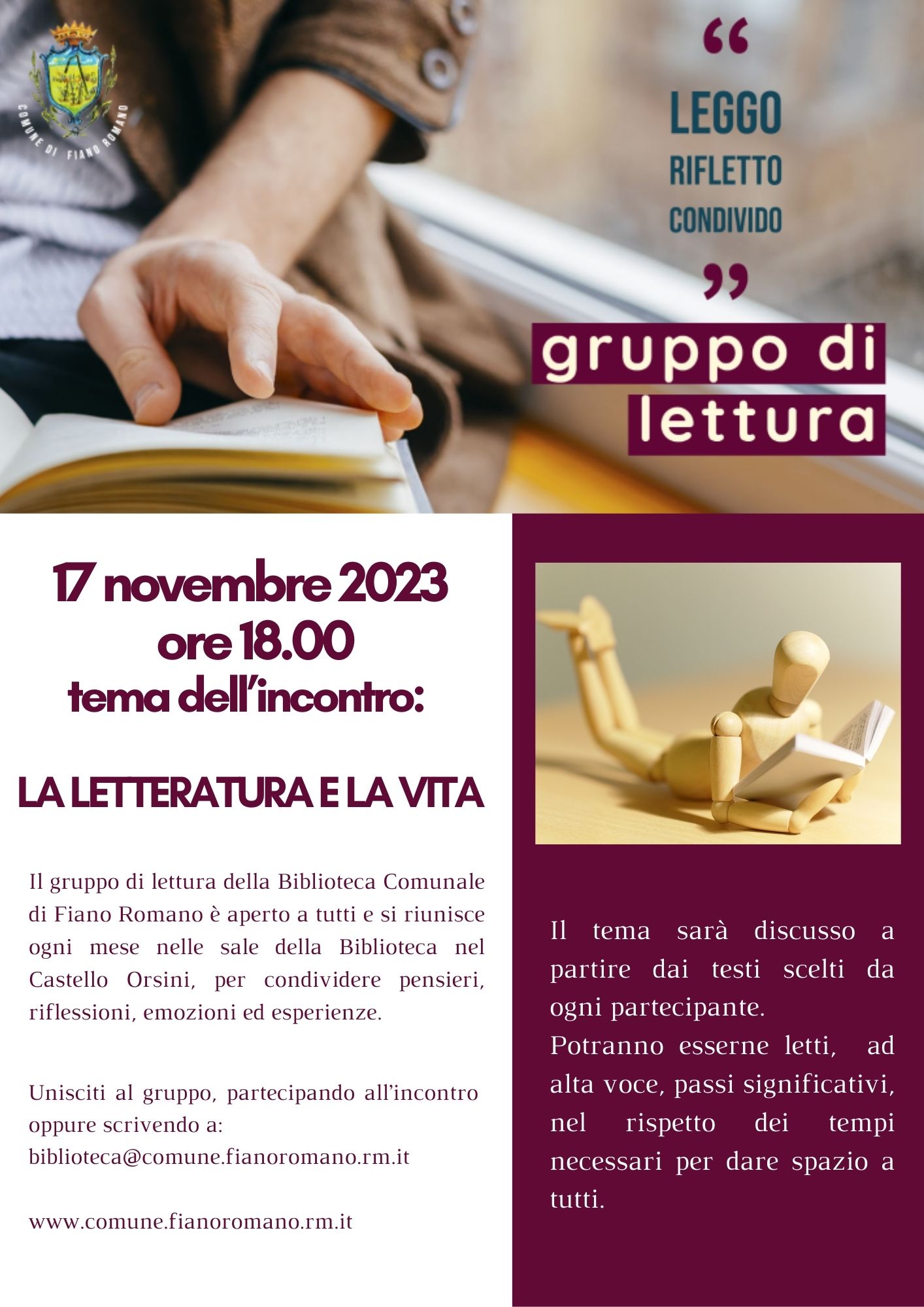 Il 17 novembre 2023 alle 18:00, si terrà l’ incontro del Gruppo di lettura il tema dell’incontro è LA LETTERATURA E LA VITA.