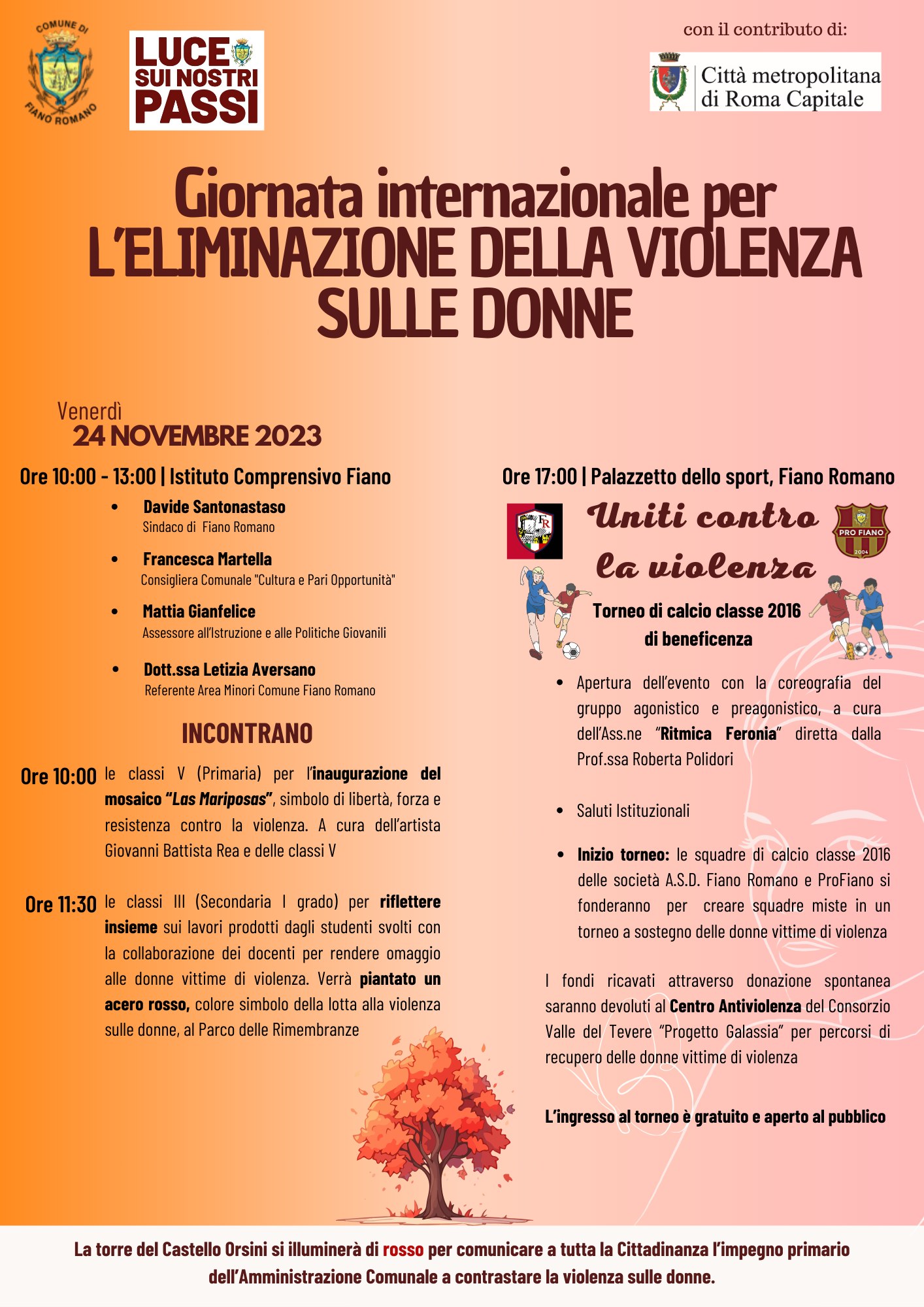 Le iniziative di Luce sui nostri Passi, il progetto ideato e promosso dall’Amministrazione Comunale di Fiano Romano e che persegue l’obiettivo di sensibilizzare le persone alle problematiche relative alla disparità di genere, avranno luogo, grazie anche al contributo della Città Metropolitana di Roma Capitale, a partire dalla mattina di domani 24 novembre.
