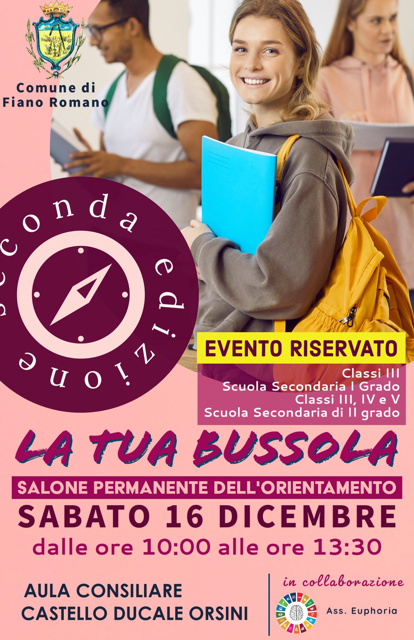 Fiano Romano, 13/12/2023 – Si terrà sabato 16 dicembre, dalle ore 10:00 alle ore 13:30, la seconda edizione del fortunato evento “La tua Bussola”. Nella prima edizione, oltre 300 persone tra studenti, docenti e genitori hanno partecipato all’iniziativa organizzata dall’Amministrazione Comunale e promossa dalla Consigliera con incarico di attività di fondi europei, internazionalizzazione, rapporti con il pubblico, Gina Luciani, in collaborazione con l’Associazione Culturale “Euphoria”.