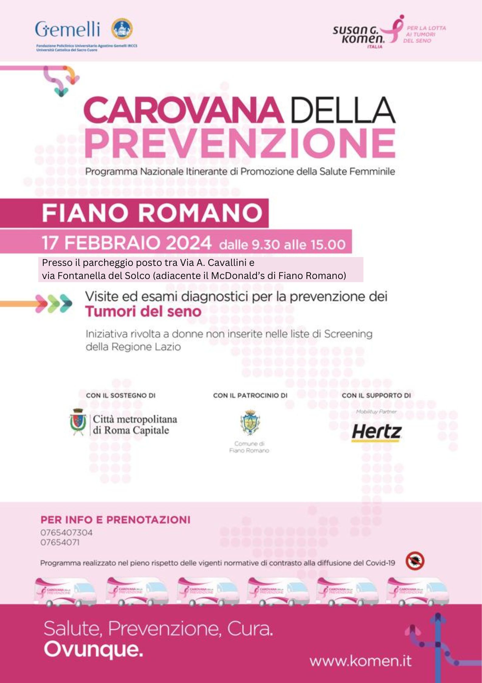 Con il progetto “carovana della prevenzione”, ideato dalla Susan G. Komen Italia, in collaborazione con la Fondazione Policlinico Universitario Agostino Gemelli di Roma, per offrire gratuitamente prestazioni cliniche diagnostiche di prevenzione alle donne che per età o per altri motivi non sono incluse nei programmi di screening offerti dalle Regioni, l’Associazione raggiunge diversi luoghi in Italia tra cui anche Fiano Romano. Il progetto, patrocinato dall’Istituto Superiore di Sanità, ha già svolto 700 giornate di promozione della salute femminile in 17 regioni italiane.