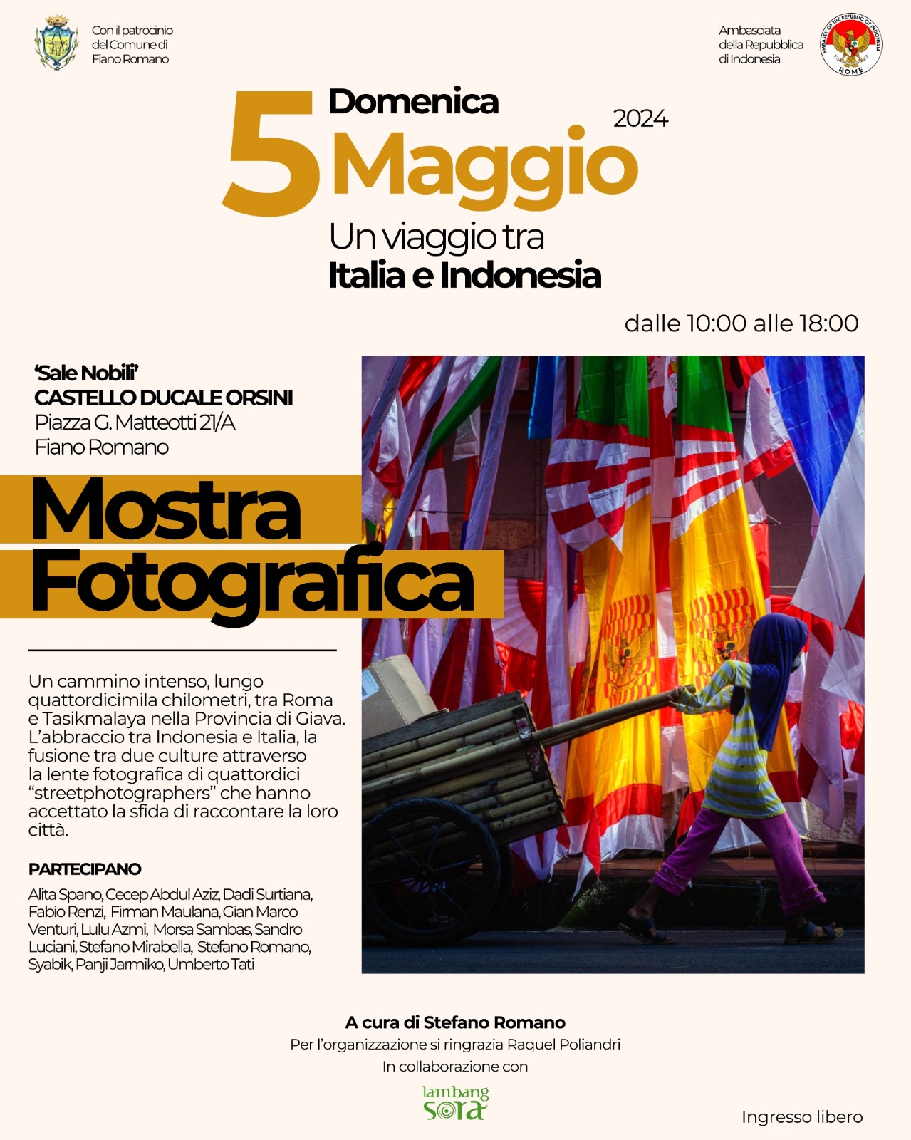 Si terrà domenica 5 maggio, dalle ore 10:00 alle ore 18:00, presso le Sale Nobili del Castello Orsini, la mostra fotografica “Un Viaggio tra Italia e Indonesia” che ha lo scopo di raccontare la fusione delle due culture, quella italiana e quella indonesiana, attraverso la lente fotografica di quattordici streetphotographers.
