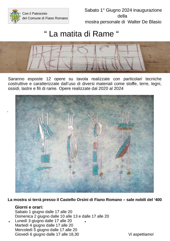 Sabato 1° Giugno 2024 inaugurazione della mostra personale di Walter De Blasio “ La matita di Rame “