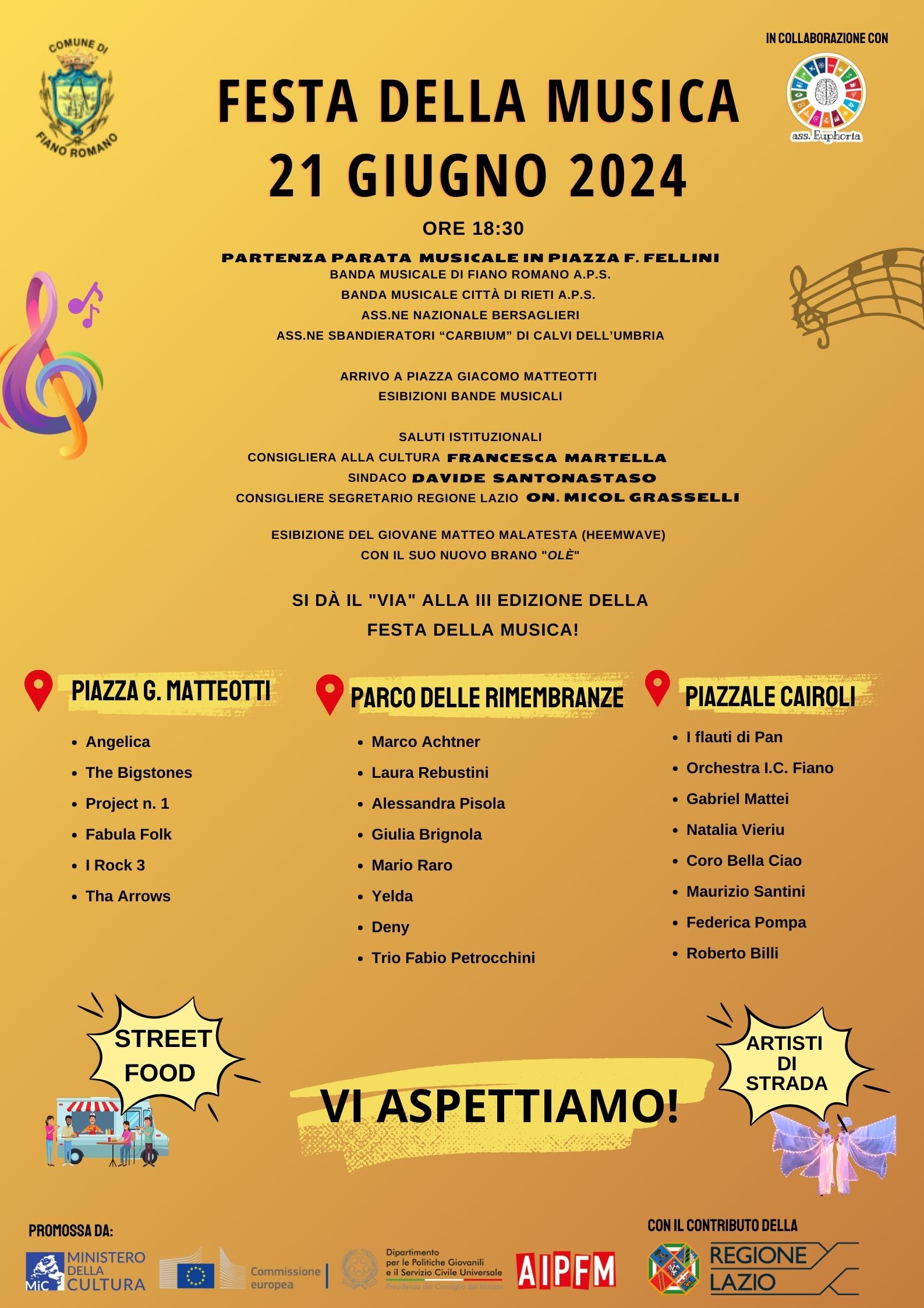 Il Comune di Fiano Romano ormai da tre anni è entrato nel circuito internazionale della Festa della Musica, promossa dal Ministero della Cultura e della Commissione europea, rappresentanza italiana.