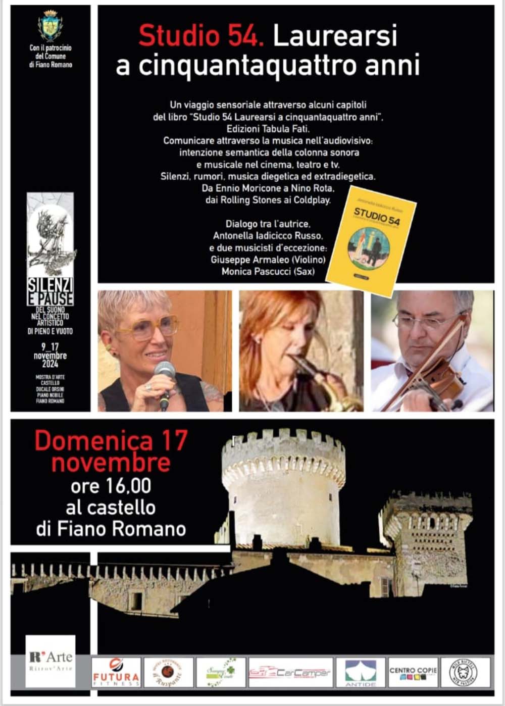 All’interno dell’evento avverrà la presentazione, da parte degli stessi autori, di due testi letterari dai titoli: “Tra streghe e cavalieri la storia del Castello Orsini” e “Studio 54, laurearsi a cinquantaquattro anni” con accompagnamento musicale di artisti vari come Roberto Billi (cantautore), Monica Pascucci (sax) e Giuseppe Armaleo (violino).
