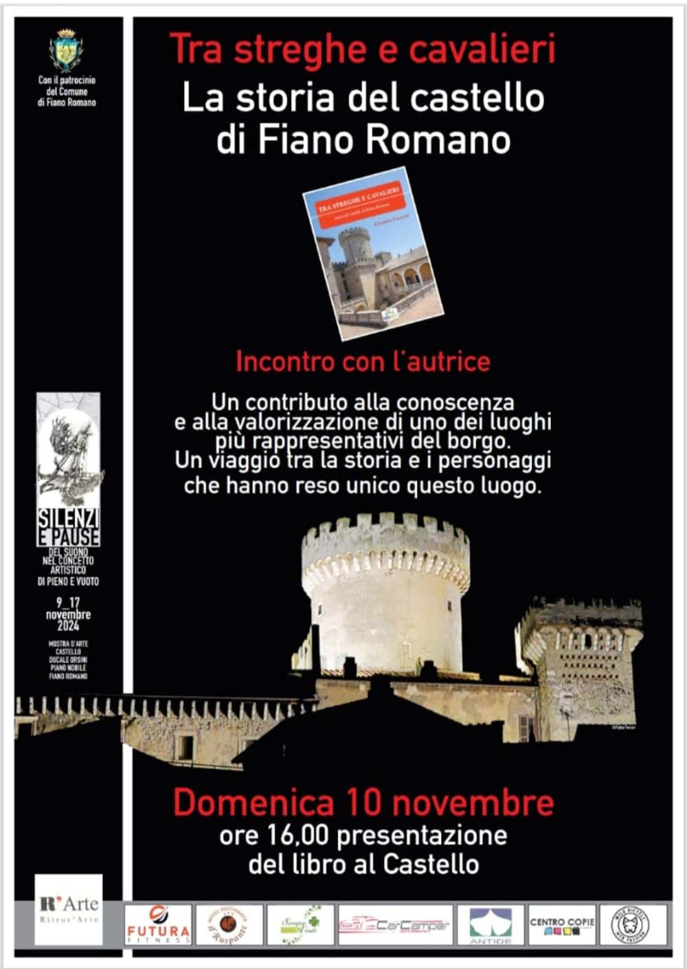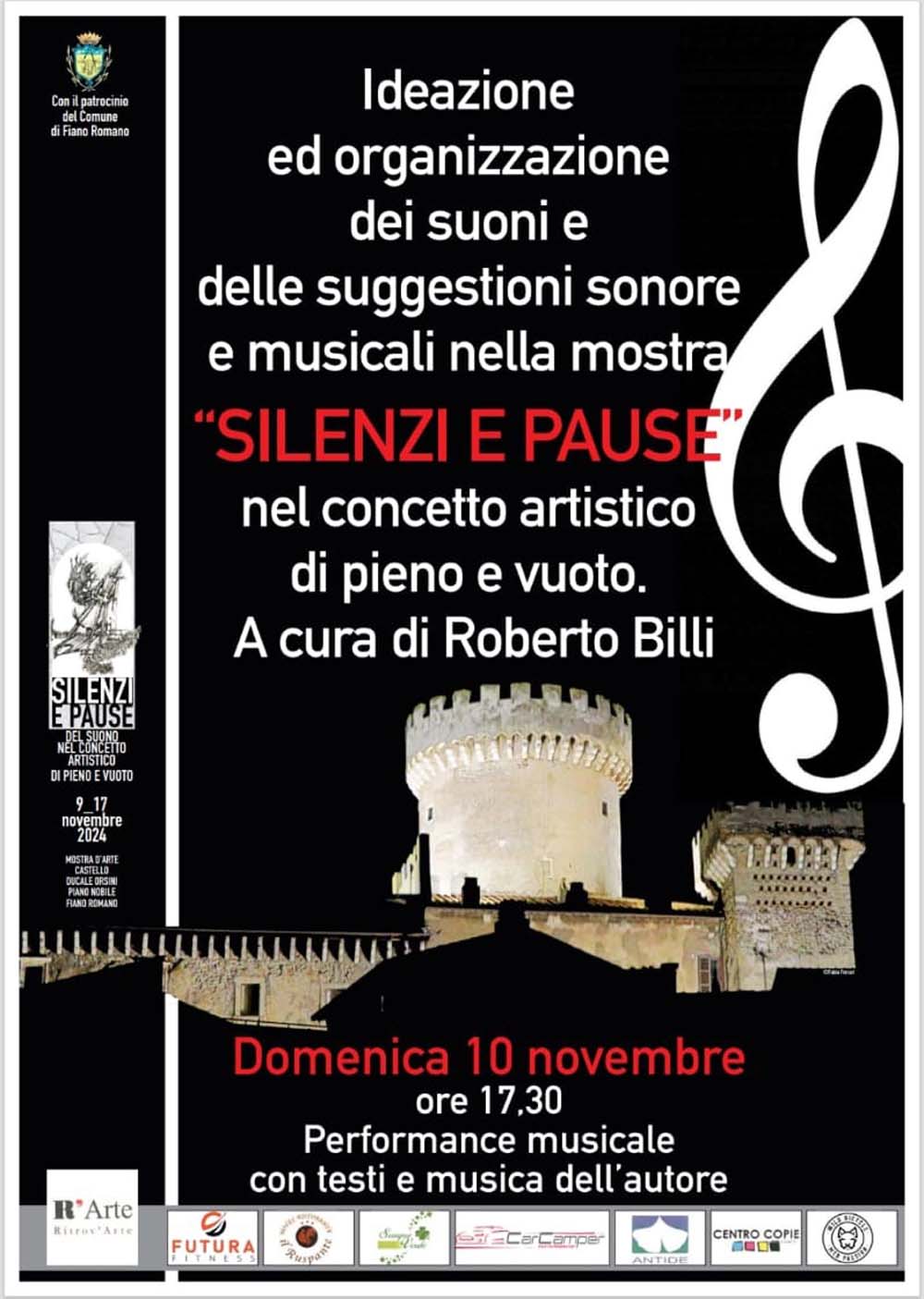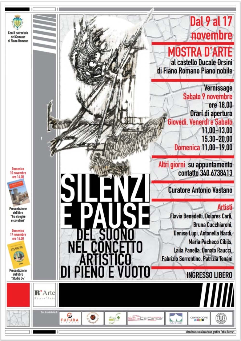 Presso il Castello Ducale Orsini di Fiano Romano, dal 09 al 17 Novembre 2024, l’Associazione “Ritrov’Arte”, con il patrocinio del Comune di Fiano Romano, presenta la mostra dal titolo: “SILENZI E PAUSE” del suono nel concetto artistico di pieno e vuoto.