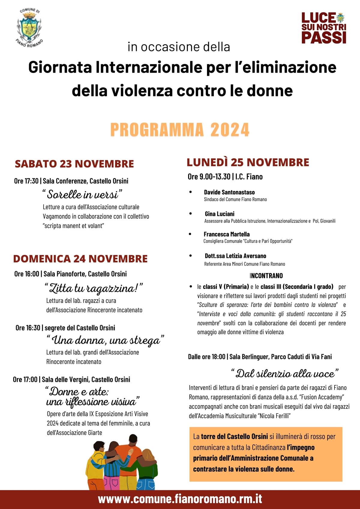 In occasione della Giornata Internazionale per l’eliminazione della violenza contro le donne, il Comune di Fiano Romano, attraverso il progetto “Luce sui nostri passi”, giunto alla IV edizione, con la collaborazione delle associazioni del territorio ha organizzato diverse iniziative volte alla sensibilizzazione dell’opinione pubblica.