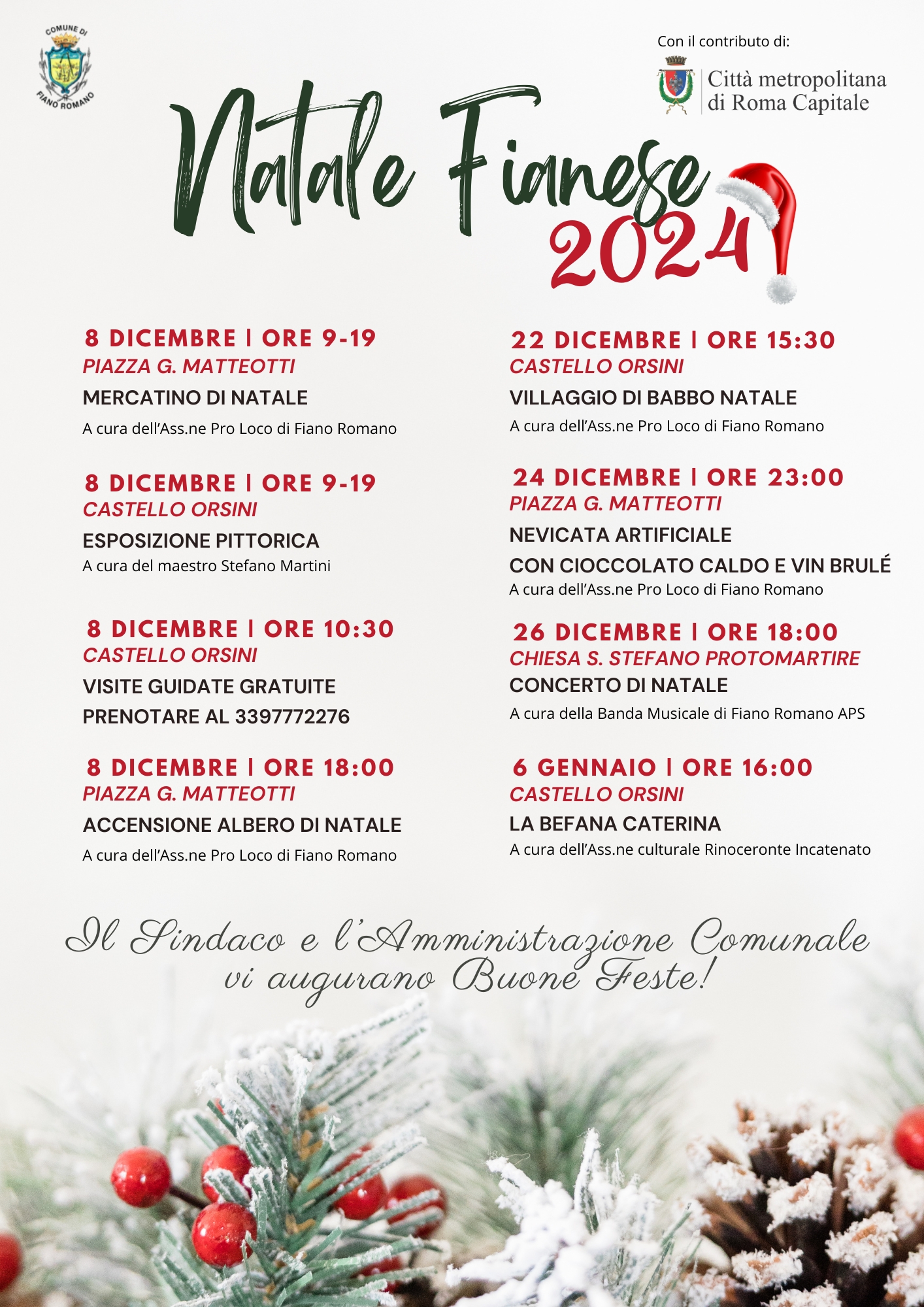 Il programma del Natale Fianese 2024 in collaborazione con Associazione Pro Loco, l’Associazione Rinoceronte Incatenato, l’Associazione di Promozione Sociale Banda Musicale e con il contributo della Città Metropolitana di Roma Capitale