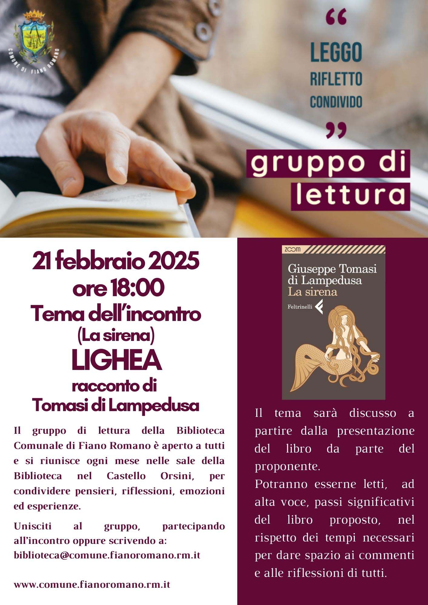 Il 21 febbraio 2025 alle 18:00, si terrà l’incontro del Gruppo di lettura, il tema dell’incontro è (La sirena) LIGHEA  racconto di Tomasi di Lampedusa.