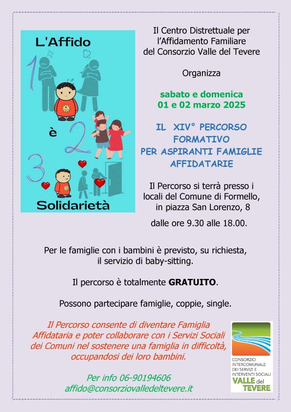 Il Centro Distrettuale per l’Affidamento Familiare del Consorzio Valle del Tevere organizza sabato 1 e domenica 2 marzo 2025 IL XIV PERCORSO FORMATIVO PER ASPIRANTI FAMIGLIE AFFIDATARIE