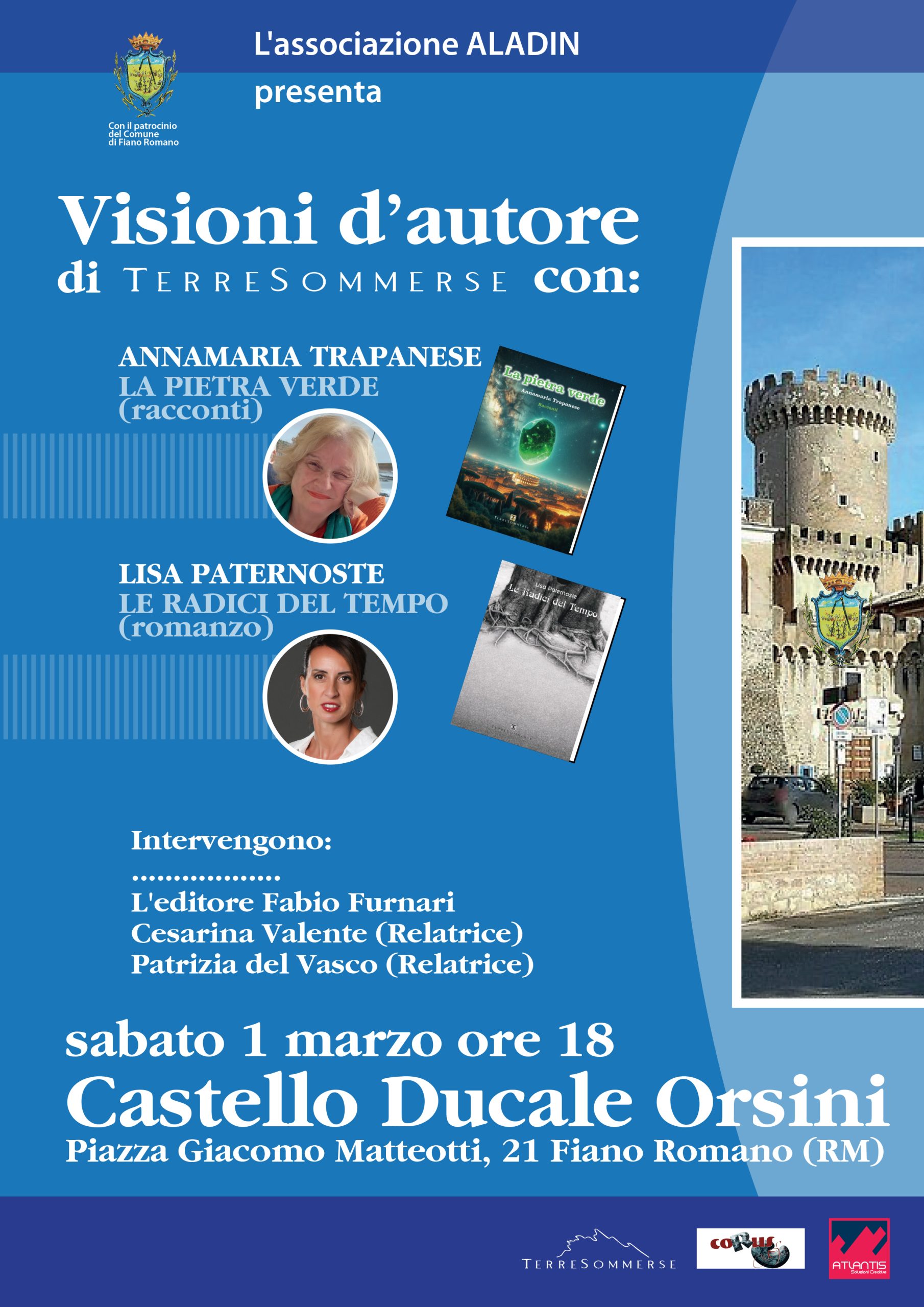 Nella prestigiosa cornice del Castello Ducale Orsini di Fiano Romano l’associazione ALADIN presenta sabato 1 marzo alle ore 18:00, Visioni d’Autore di Terre Sommerse edizioni con: Annamaria Trapanese “La pietra verde” (Racconti); Lisa Paternoste “Le radici del tempo” (Romanzo).