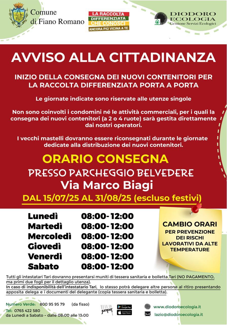 AVVISO ALLA CITTADINANZA INIZIO DELLA CONSEGNA DEI NUOVI CONTENITORI PER LA RACCOLTA DIFFERENZIATA PORTA A PORTA – Dal 15/07/25 al 31/08/25