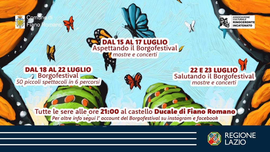 L’ Associazione Culturale Rinoceronte Incatenato con il Patrocinio del Comune di Fiano Romano e il contributo della Regione Lazio fondo per le iniziative di promozione e valorizzazione del terrotorio regionale ai sensi dell’art. 5 LR 30 dicembre 2024 n. 22, presenta la XXVI Edizione del Borgo Festival 2025