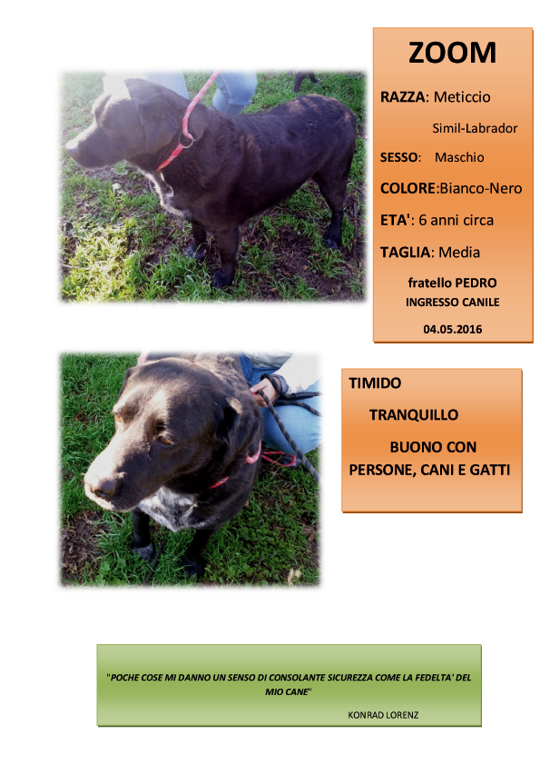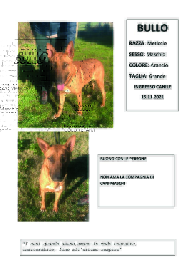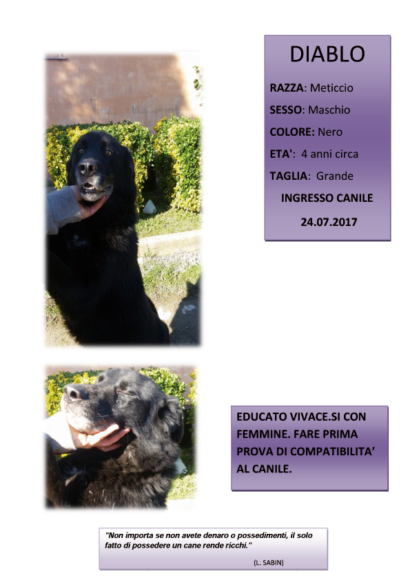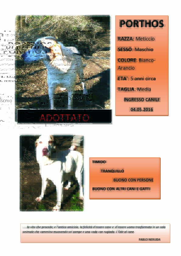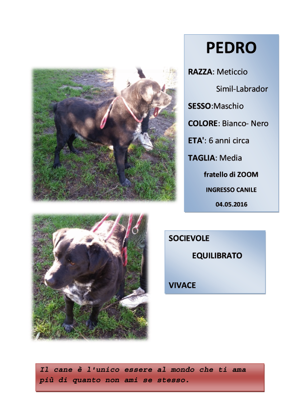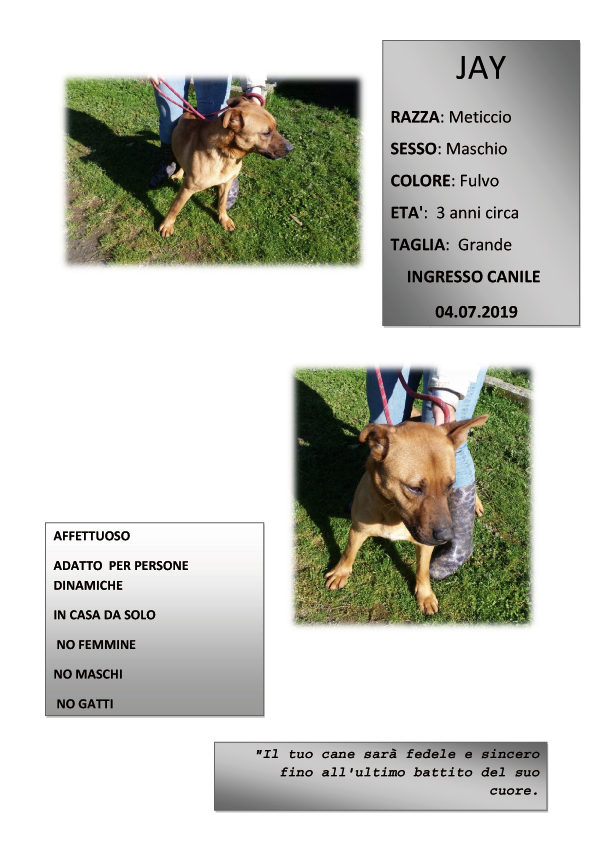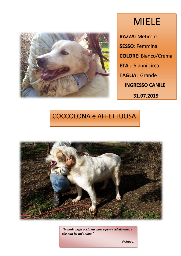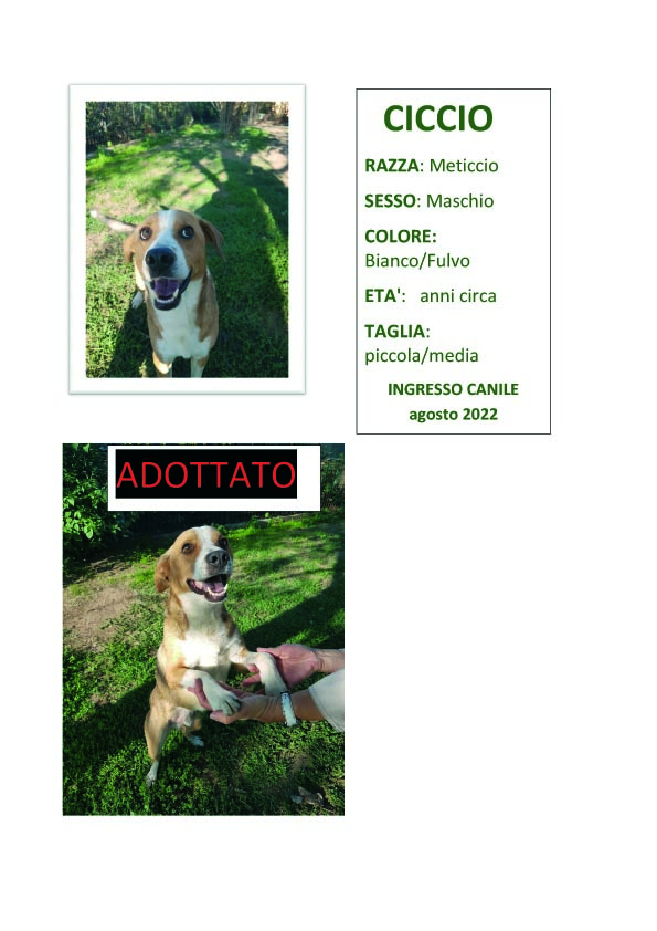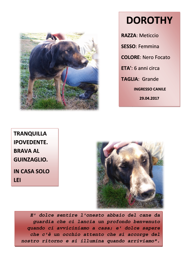 - Darai al cane la possibilità di essere felice semplicemente salvandogli la vita e donandogli una nuova famiglia. Il cane sarà consegnato con il microchip i vaccini e con le cure antiparassitarie effettuate.